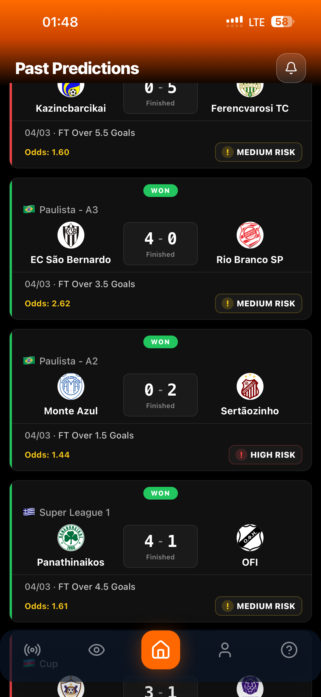 Tüm tahminler (kazanan ve kaybedenler) geçmiş sekmesinde görünür. Gizlenen bir şey yok.